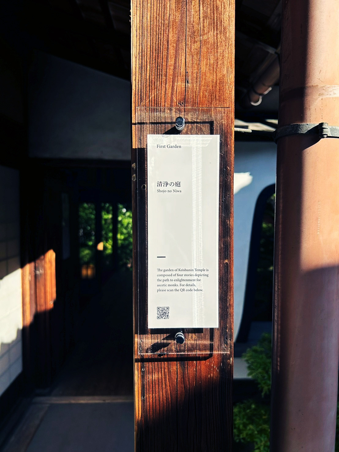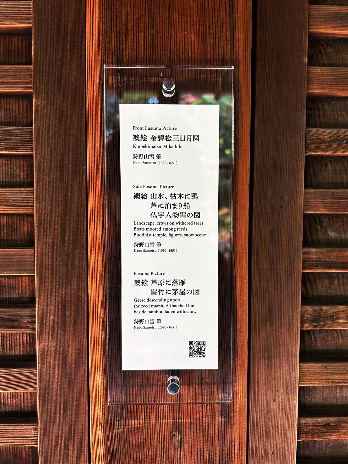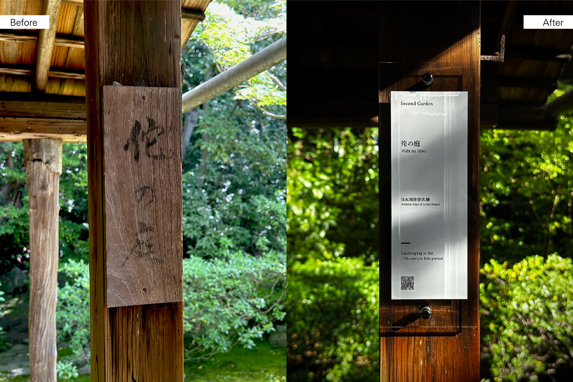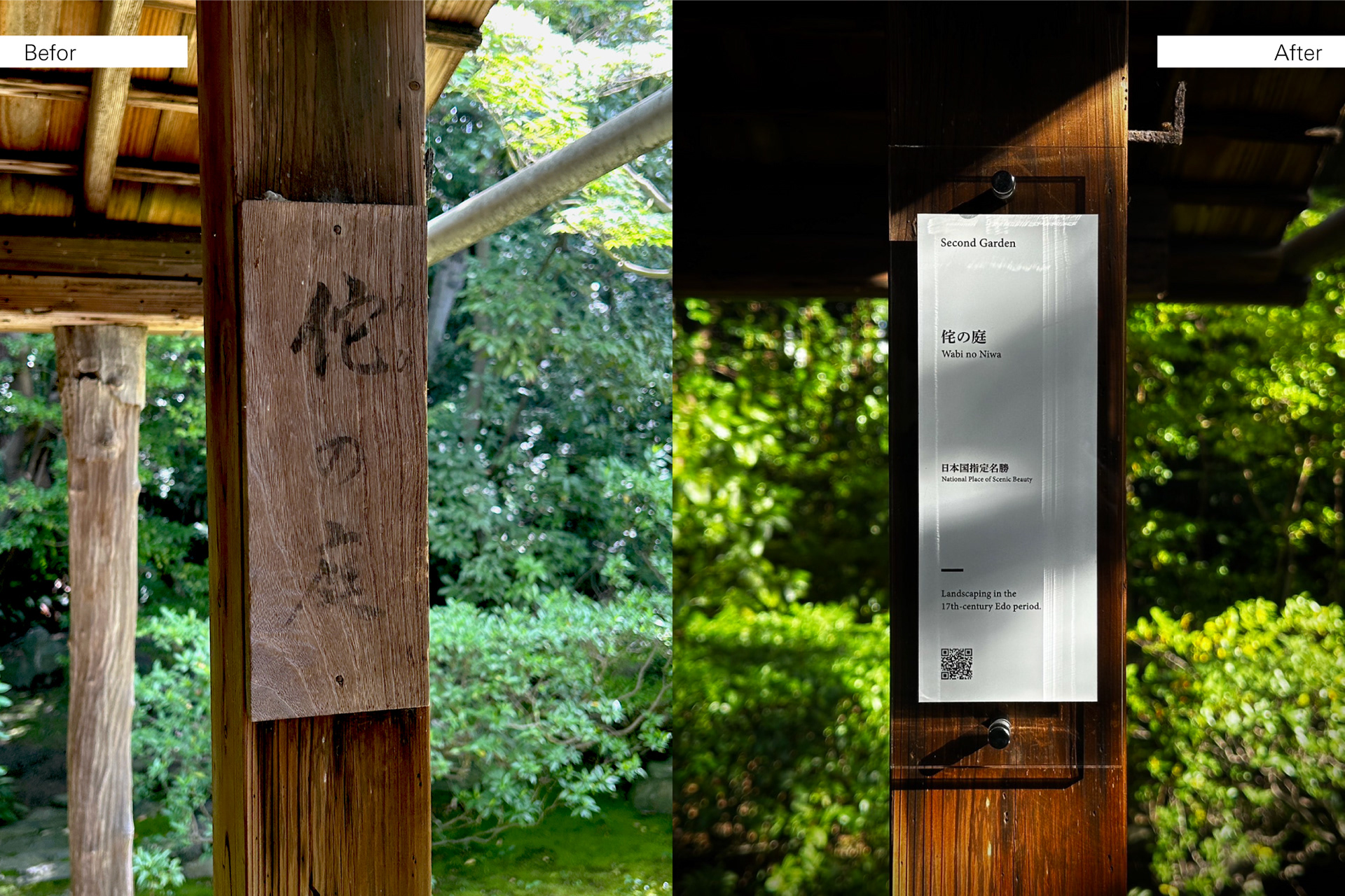 桂春院のサイン一部を改修。定点として機能していたサインをキャプションのサインへと刷新。襖絵から庭まですべて作品として捉えギャラリー空間として演出。既存サインと同位置に施工することで、これまであったサインの痕跡が見え隠れし現在と過去の様子が楽しめる仕掛けを施しました。